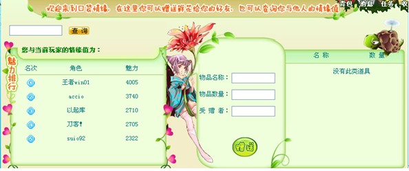 活动更新后,所有副本怪物将有几率掉落玫瑰、巧克力豆等道具,获得道具后可以进入绘画小屋,查询你想要赠送礼物的玩家,将你收集到的玫瑰和巧克力赠送给他哦!收到巧克力豆或者玫瑰的玩家将会获得相应的情缘值。活动结束后,单区情缘值最高的玩家可以获得“全城热恋”绝版婚戒一对哦!拥有婚戒的玩家可以将其中一只婚戒赠送给其他玩家,以获得情侣关系。