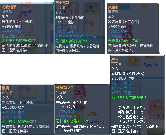 至尊神石、涅盘神丹、上品捏成丹、五彩龙珠、★背包升级卷轴★、水晶卡、修炼仙册等等,极品散装装备龙纹铠甲、擎天战靴、风雷链、展翼、阿瑞斯之手、通天、部分宠物卵礼券及进化道具。