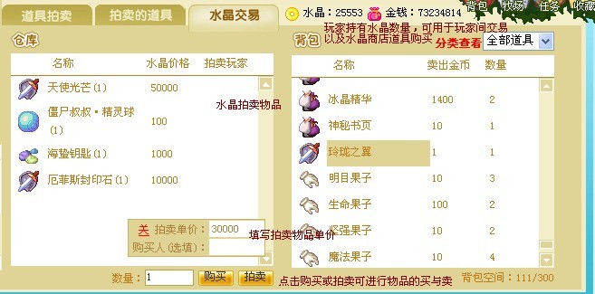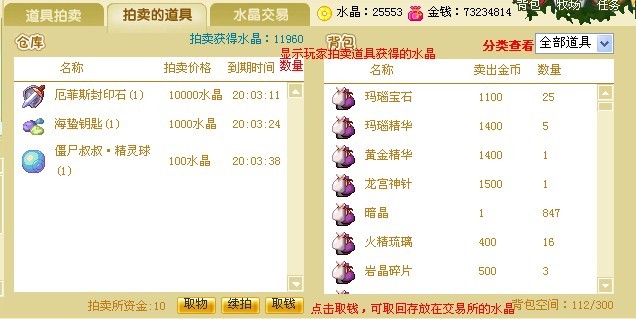 水晶交易同道具拍卖功能具有异曲同工之妙,不同的是,道具拍卖收到的是金币,而水晶交易收到的是水晶币哦,水晶币的用途多多。