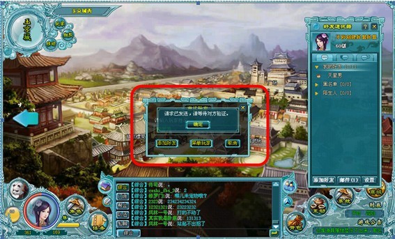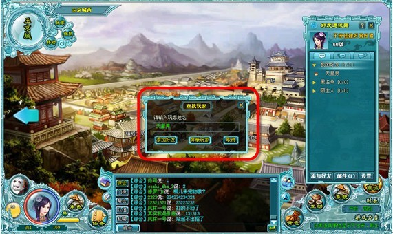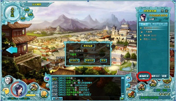 在弹出的对话框中输入玩家的角色名,然后点击添加好友按钮,如下图红圈处。