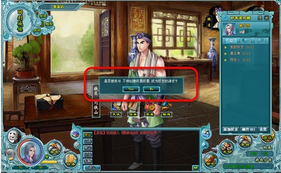 被添加的一方点击该图标后将弹出时候接受XX好友请求的对话框,同意点击Yes,不同意点击No,如下图红圈处。