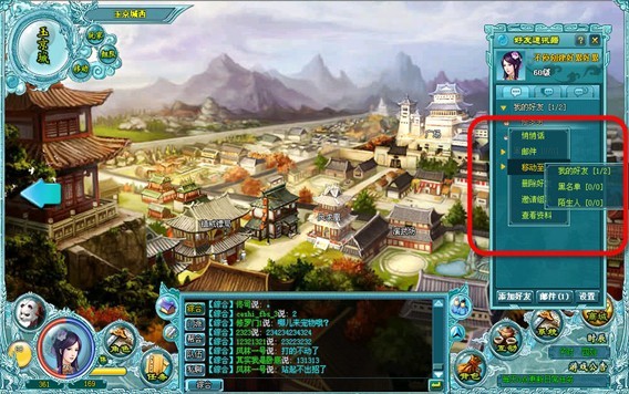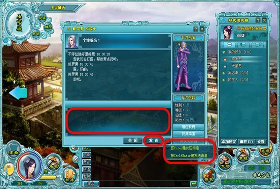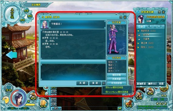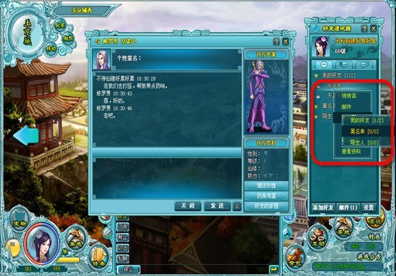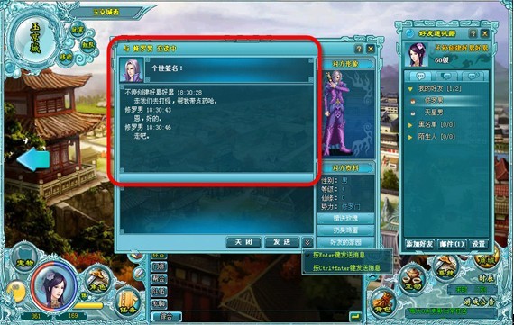 在好友聊天界面中可查看对方形象、头像、个性签名、对方资料、好友家园相关的信息,并可向好友赠送玫瑰和扔臭鸡蛋来提高仙缘值。